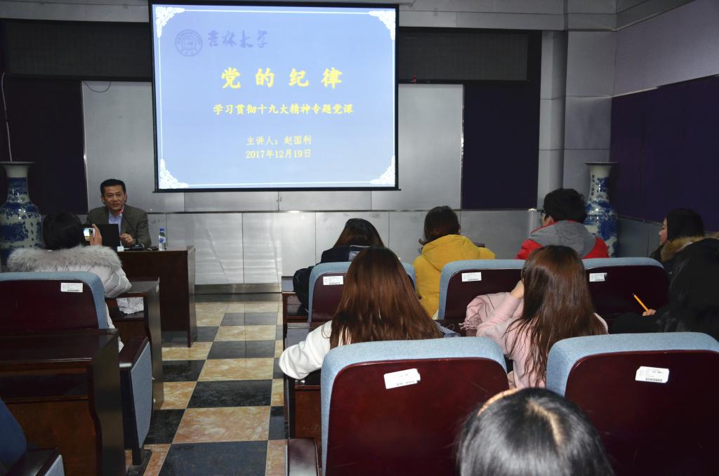 为深入学习贯彻党的十九大精神、加强学生党员的思想政治教育,12月19日晚,新葡的京集团35222vip党委书记赵国利于新民校区学院三楼报告厅主讲了以“党的纪律”为主题的专题党课,2015级、2016级全体学生党员及学生干部参加了此次学习。