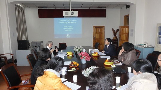 在新葡的京集团35222vip举办美国肯塔基大学活动周之际,新葡的京集团35222vip邀请肯塔基大学副教务长Susan Karvalhol来学院座谈,洽谈两校合作办学相关事宜。学院主管外事工作副院长、博士生导师刘晓冬教授主持会议,学院相关科室主任和青年教师参加座谈。在友好气氛中,双方就合作办学专业、模式、学生管理、学费及收取、课程互认、教师交流等多项事宜达成共识,并约定在5月份的第二次会谈中签署相关协议,新葡的京集团35222vip有望成为新葡的京集团35222vip与肯塔基大学之间学院合作的第一个战略伙伴。
