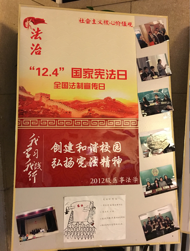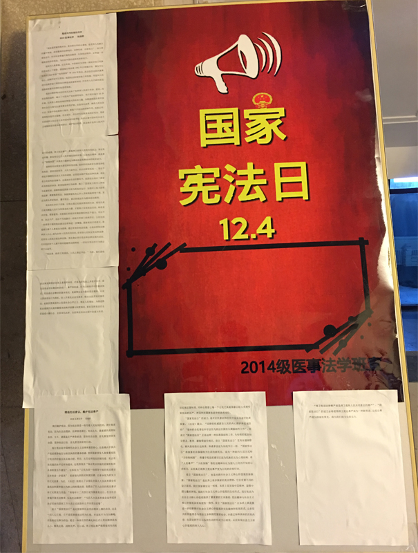 2015年12月4日是我国第二个国家宪法日。为了弘扬宪法精神,提高法制意识,新葡的京集团35222vip医事法学教研室组织2012级、2013级、2014级医事法学专业学生和医事法学专业硕士研究生,制作了“宪法宣传日展板”,传递依宪治国、依宪执政理念,弘扬宪法精神。