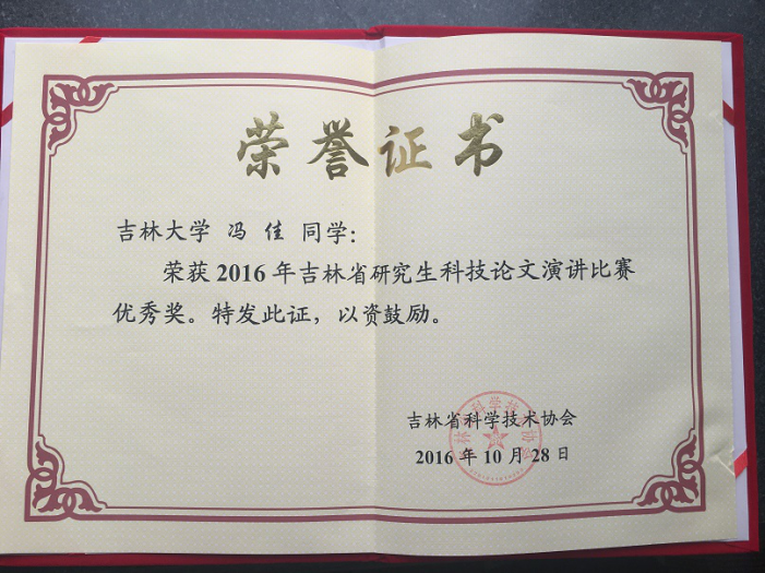 为培育造就优秀青年科技人才,打造吉林省高层次科技创新人才后备队伍,吉林省科学技术协会举办了“2016年吉林省研究生科技论文演讲比赛”。新葡的京官网医学信息学专业2014级博士研究生冯佳(指导教师张云秋教授),荣获2016年吉林省研究生科技论文演讲比赛优秀奖。