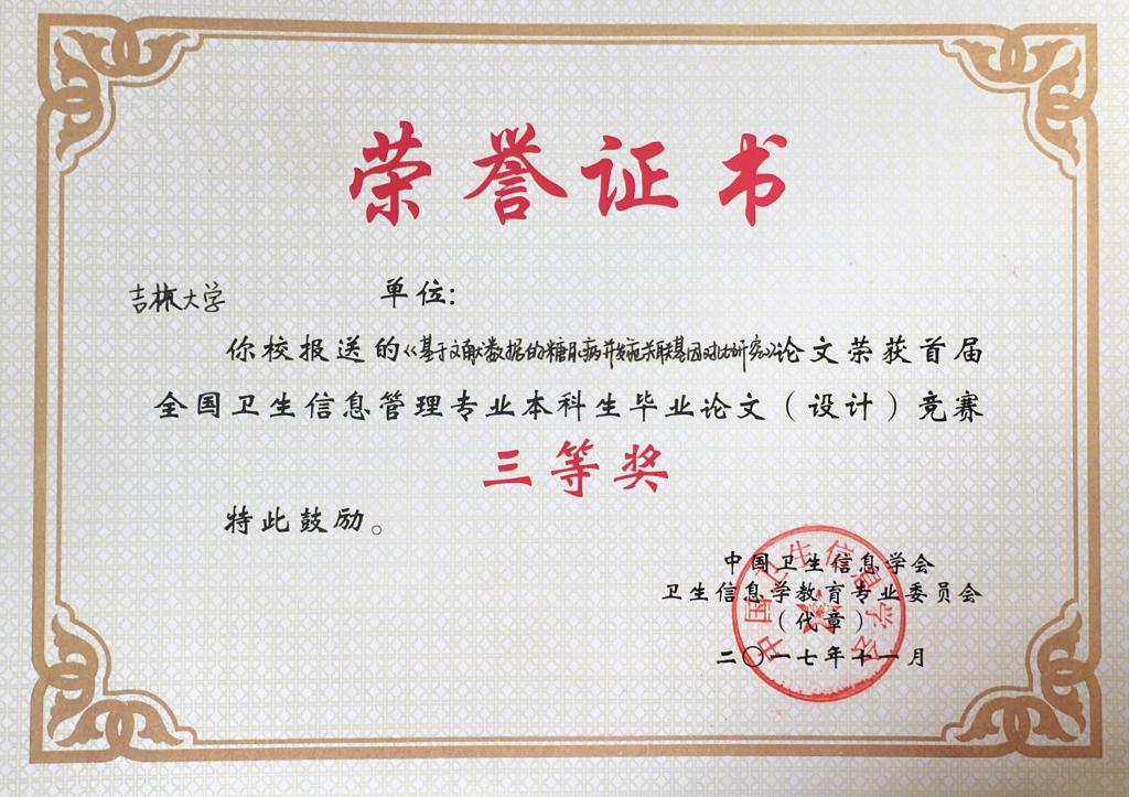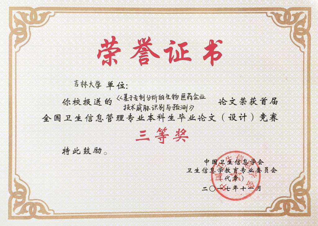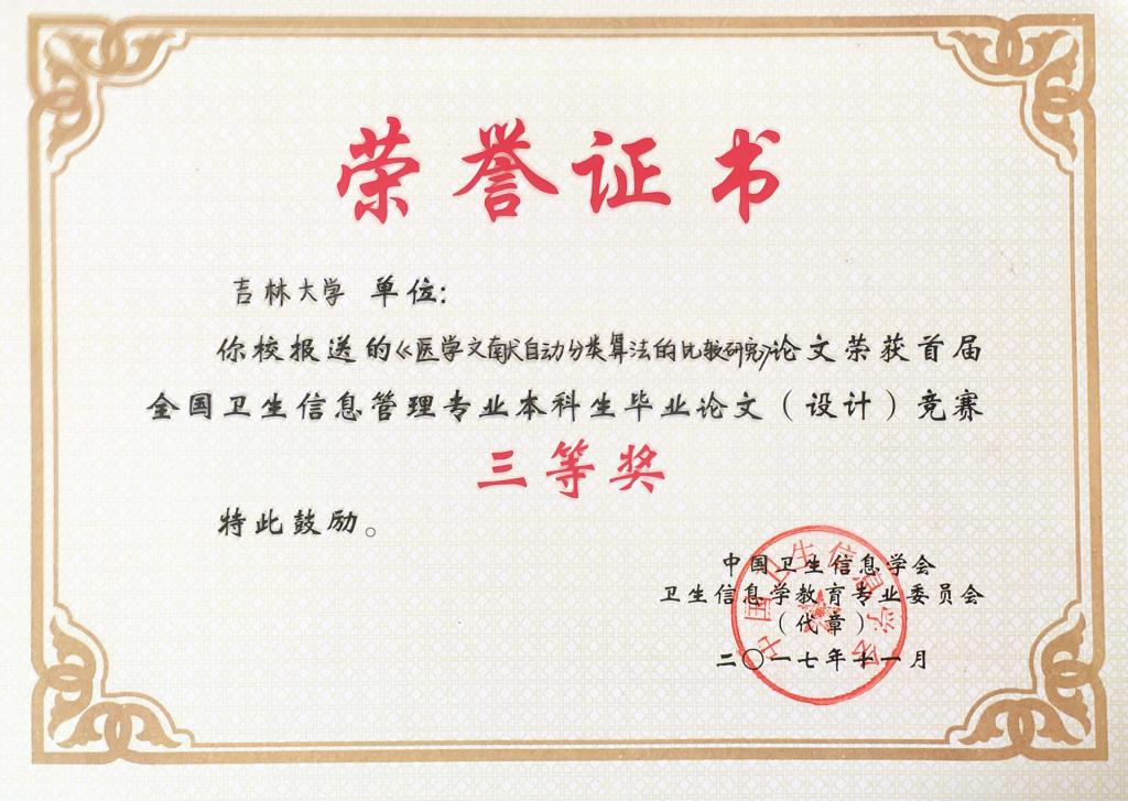 新葡的京集团35222vip、华中科技大学、中南大学、中国医科大学、山西医科大学、重庆医科大学、广西医科大学、广东医科大学、南通大学、河北北方学院、徐州医学院、滨州医学院、济宁医学院、新乡医学院、湖北医药学院、成都医学院等院校共报送参赛论文作品69篇。经本次竞赛专家委员会匿名评审,共有31篇论文获奖,其中一等奖论文6篇、二等论文10篇、三等奖论文15篇。根据竞赛规则,新葡的京官网从2017届信息管理与信息系统(医药信息管理)专业本科毕业论文中选送参赛论文9篇,其中《用户主题熟悉度对查询重构行为的影响及熟悉度预测》(刘强,指导教师:孙丽副教授)获本次竞赛一等奖;《基于专利分析的生物医药企业技术威胁识别与预测》(李芳芳,指导教师:王伟教授)、《医学文献自动分类算法的比较研究》(张雅鑫,指导教师:张云秋教授)、《基于文献数据的糖尿病并发症关联基因对比研究》(金姗,指导教师:牟冬梅教授)分别获得本次竞赛三等奖,获奖论文数量位列参赛各院校首位,比较客观地反映了新葡的京官网本科教学取得的成果。