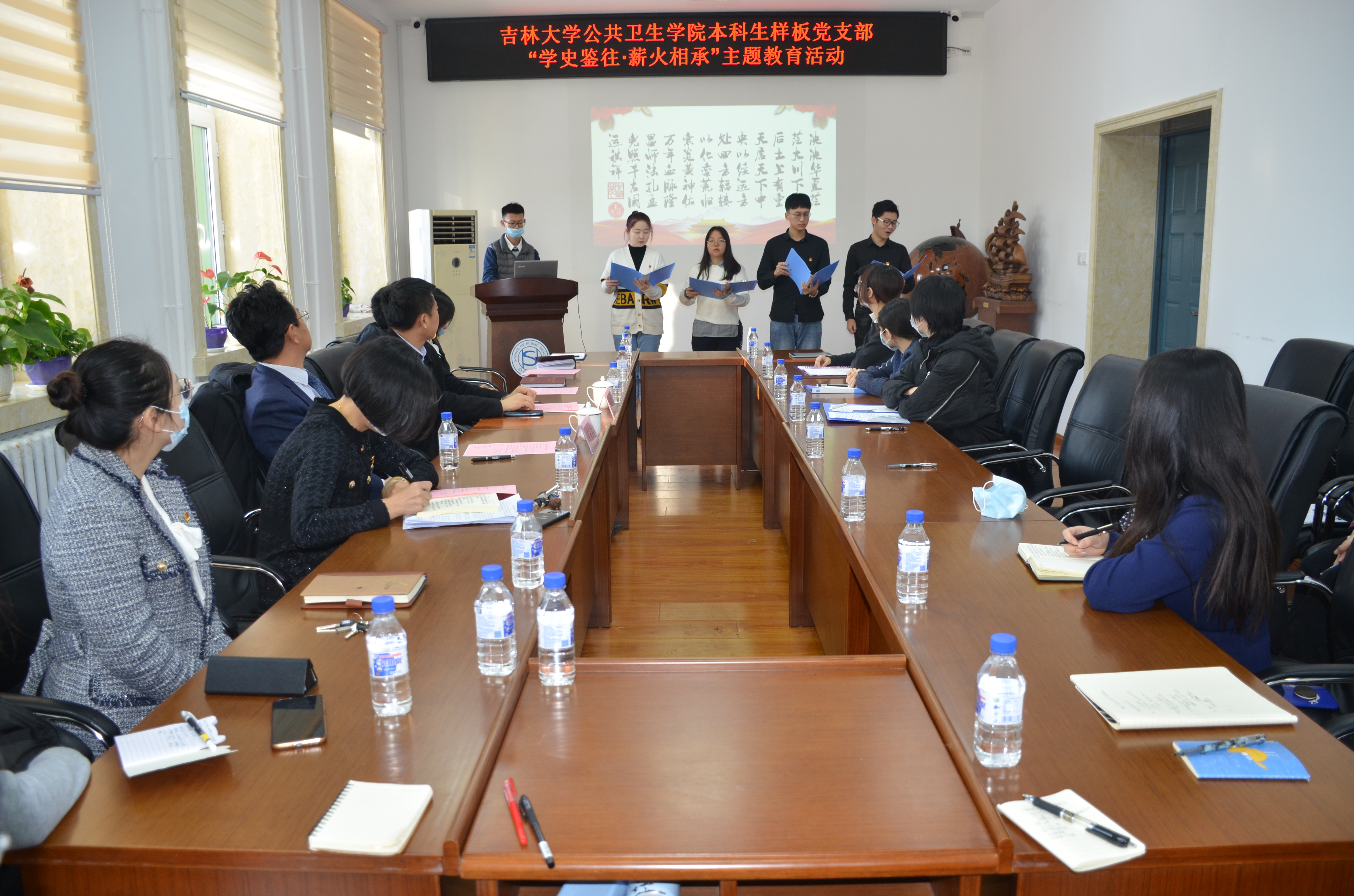 学生党员代表从“砥砺风雨,星火燎原” 、“御侮挥戈,血染山河”、“守望相助,攻克时艰”、“万里蹀躞,以梦为归”四个主题单元对“四史”学习成果进行了汇报展示。冯浩同学选取了中共一大、新中国成立、改革开放等重要历史时间节点,为大家梳理了中国共产党发展的光辉历程和中国共产党的伟大革命精神。在共同观看抗美援朝纪录片《为了和平》(片段)后,王美淇同学同大家一起回顾抗美援朝历史,解读抗美援朝精神,引发新时代当代大学生的思想共鸣。王柳璎、王琼同学分别从抗疫一线志愿者和“最美逆行者”家属的角度分享了疫情期间的所见所感,讲述作为公卫学子的使命与担当。卞骏业、李彪、刘玟彤、于馨一同学共同朗诵《中国梦赋》,以诗赋的形式讲述中国故事,传递中国力量,慷慨激昂的词句描绘了党和祖国从无到有的巨变,勾勒出中国全面建设社会主义现代化强国的光明前景。与会人员心潮澎湃,深受触动。