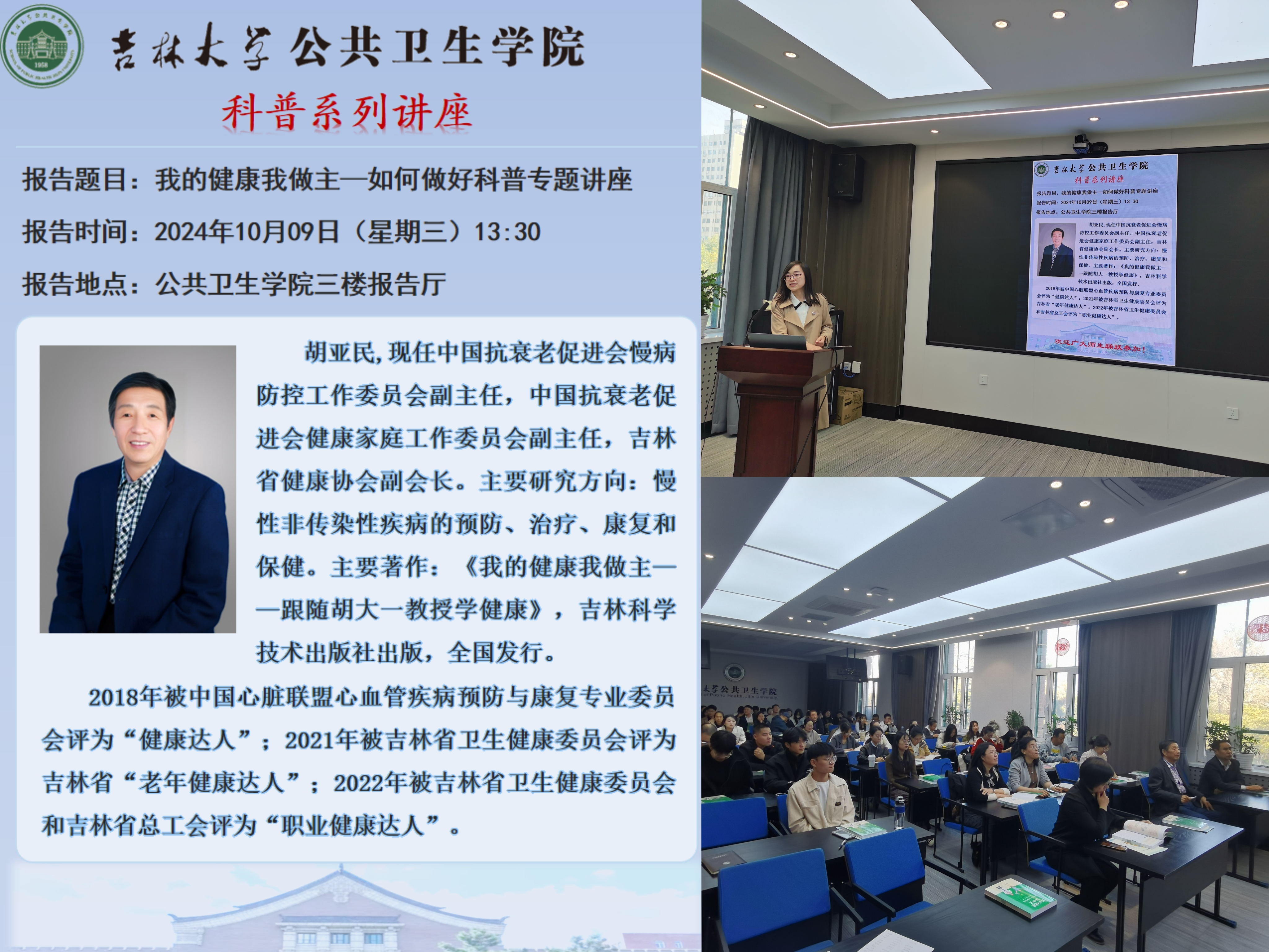 为积极响应2024年全国科普日暨吉林省第二十二届科普周活动,进一步增强新葡的京官网师生健康意识,倡导健康生活,10月9日下午,新葡的京集团35222vip特邀吉林省健康协会副会长胡亚民作《我的健康我做主》主题讲座,为全院师生普及健康保健知识。本次活动由新葡的京集团35222vip王娟副院长主持。