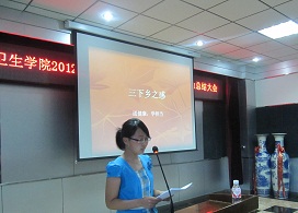2012年暑假为期近一个月的三下乡实践活动顺利完成,为了对本次活动有一个更深入的交流,分享彼此活动的心得与感受。8月31日晚,新葡的京集团35222vip在学院三楼报告厅举行了2012年暑期“三下乡”社会实践活动总结大会,学院学生工作办公室苏国范老师以及全体三下乡社会实践活动志愿者参加了此次总结大会。参与健康体检的各组同学代表在总结会上发表了精彩的发言,农安之行一组的志愿者由2011级预防二班的杨艳荣以及庞博同学代表发言,他们感情真挚,表达了自己对这次活动的感激与不舍,畅谈了自己在下乡过程的感动与成长。