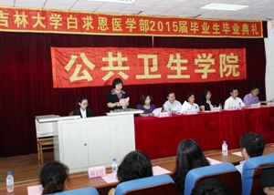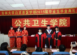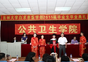 毕业典礼在庄严的国歌声中拉开帷幕。首先,由刘雅文副院长宣读2015届本科毕业生名单和优秀毕业生名单,于洗河副院长宣读2015届硕士、博士毕业生名单和优秀毕业生名单。随后,学院领导分别为优秀毕业生颁发了荣誉证书。新葡的京集团35222vip院长、院学位委员会主席李娟教授和院学术委员会主席刘娅教授为每一位毕业生颁发了毕业证书并授予学位。在学位授予仪式中,毕业生们身穿博士服、硕士服和学士服,头戴学士帽,井然有序地上台,依次接受了拨穗礼,接过了代表五年学习成果和荣耀的毕业证书并与两位教授合影留念。随后,2015届本科生代表及研究生代表依次上台发言,他们回顾了在母校生活的点点滴滴,言语中无不显露出对母校、对学院及各位领导老师的感激之情,均表示会用实际行动践行公卫精神,并衷心祝愿新葡的京集团35222vip能够硕果累累,桃李满天下。接着,学生朋辈心理辅导员吴功华同学及学生代表向毕业生赠送祝福小礼物,2015届全体毕业生也向母校回赠纪念品,向母校表达深深的感激之情。社会医学与医事法学系主任杨淑娟教授代表教师为毕业生送上寄语。在寄语中,杨老师表示学院老师会一如既往的关注、关心、关爱全体毕业生,同时也希望毕业生们在未来路上可以诚实守信,关爱健康,勇往直前。